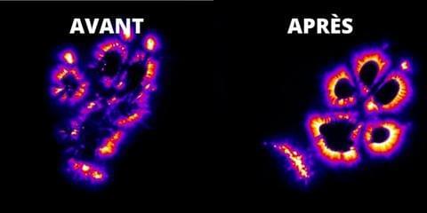 Ces clichés ont été pris en laboratoire isolé de toutes ondes avec un appareil très sophistiqué. La patte du petit chien a été photographiée avant, au temps 0 et sur un laps de temps de 5 heures. Les tests ont été faits avec le collier mis sur le chien. Le temps 0 est au moment où on met le collier au chien.